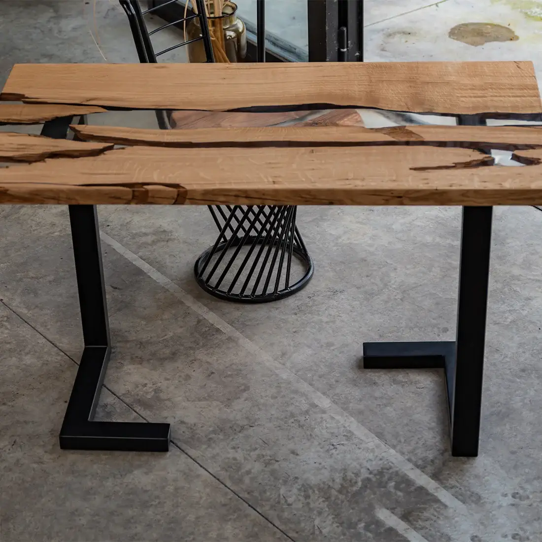 Detta vackra bord/disk är specialtillverkat för dagligt pappersarbete, med hjälp av en glansig transparent harts. Vi har gett bordet en perfekt rak kant, vilket ger en känsla av soberhet och allvar åt detta ojämna arbete. Skivan är behandlad med en naturlig vaxbaserad olja. Benen är gjorda av rörformat järn och har en minimalistisk mattsvart ram.