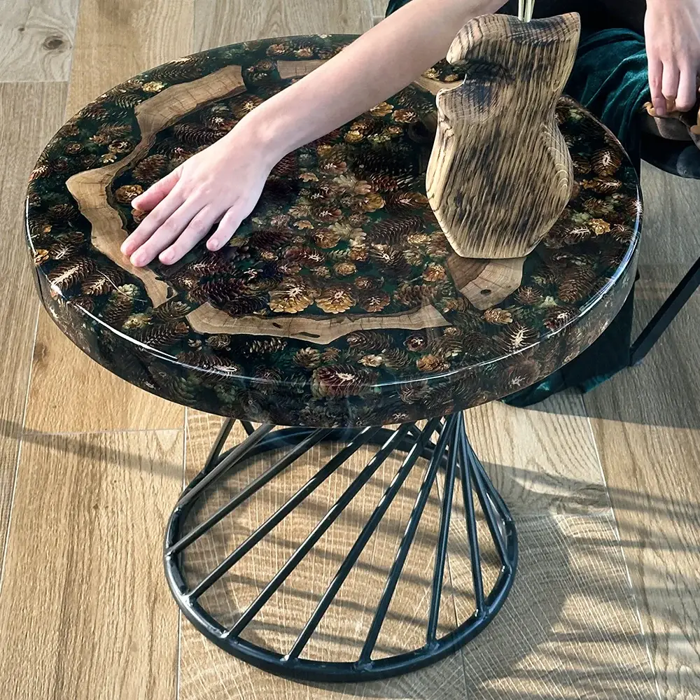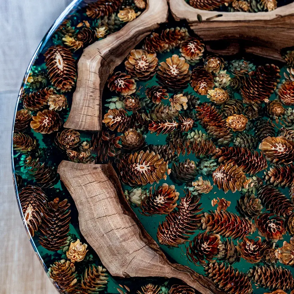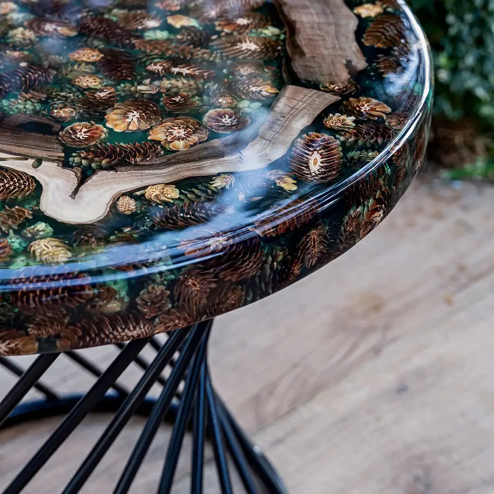 Detta fantastiska, specialtillverkade soffbord är tillverkat av torkade lärkkottar omgivna av europeisk valnötsträ och i kombination med transparent grön harts.