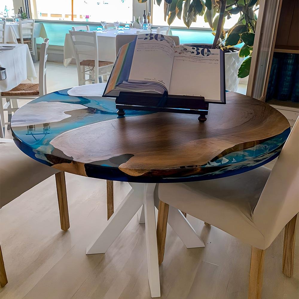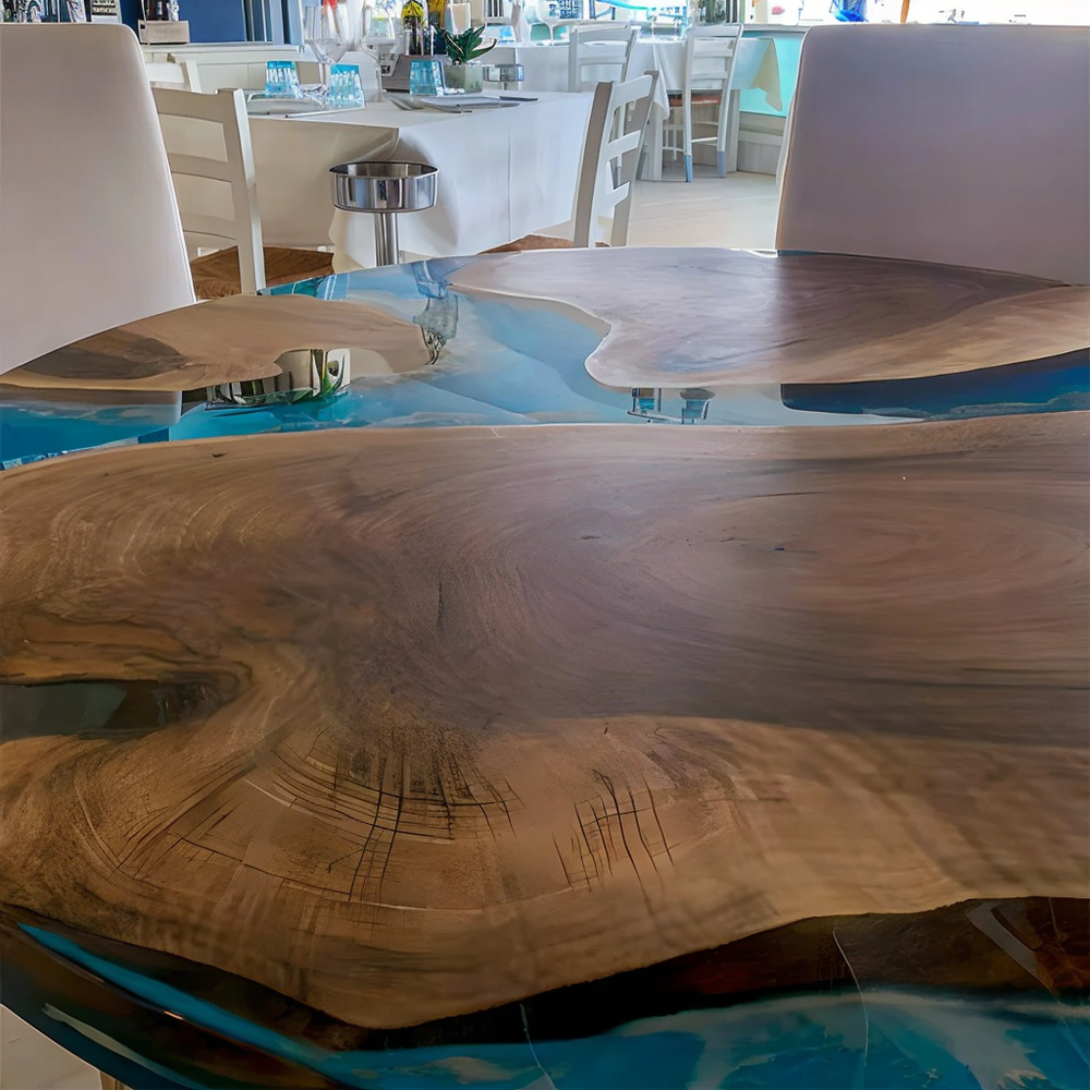Detta underverk, specialdesignat för en välkänd restaurang i ett kustområde, tillverkades av utsökta europeiska valnötsnålar och blått och vitt harts med marin effekt, vilket återspeglar det vattenliknande temat. Detta bord frammanar verkligen bilden av ett land badat av havet.