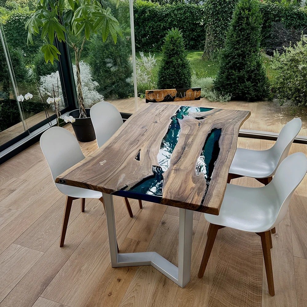Tvåtonig turkosgrön harts har applicerats på bordsskivan, vilket skapar en fängslande och modern effekt. Turkosgrönt är en djup, vibrerande grön nyans som ger bordet en touch av fräschör och vitalitet.