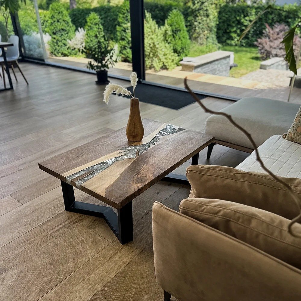 utmärkande drag är det silverpigmenterade hartset. Hartset har hällts i mitten av bordet, vilket skapar en genomskinlig, skimrande effekt. Den silverpigmenterade färgen ger en touch av modernitet och elegans till den övergripande designen. Hartset smälter sömlöst in i valnöten och skapar en fängslande kontrast mellan det mörka träet och den silverfärgade glansen.