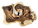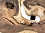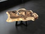 Detta soffbord är tillverkat av ett enda stycke suarträ, även känt som Samanea Saman. Dess organiska former och ojämna yta återspeglar naturens vilda skönhet, med dess utpräglade ådring och unika kurvor. De svarta metallbenen med en subtil antik effekt ger stabilitet och karaktär utan att förringa träets skönhet.