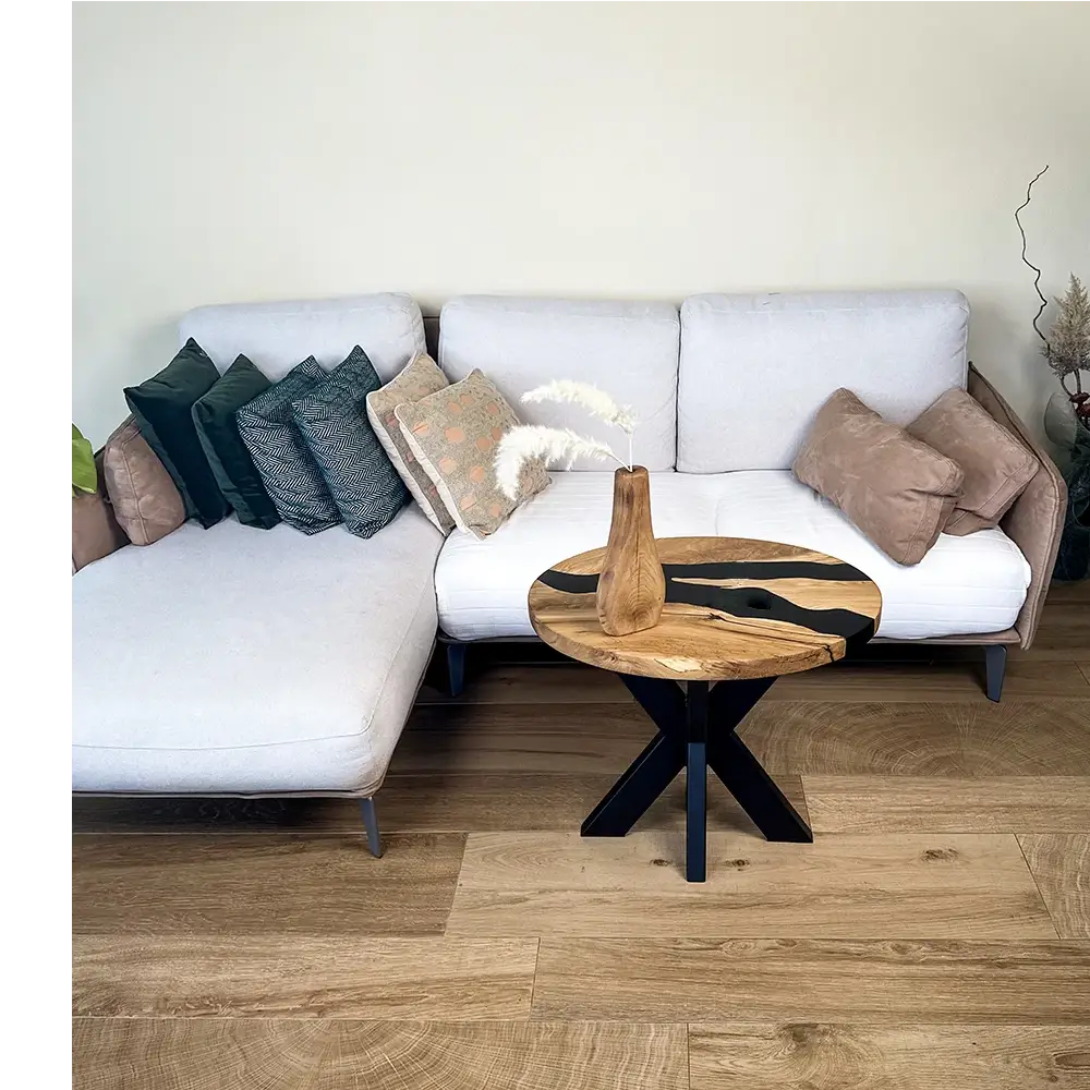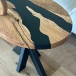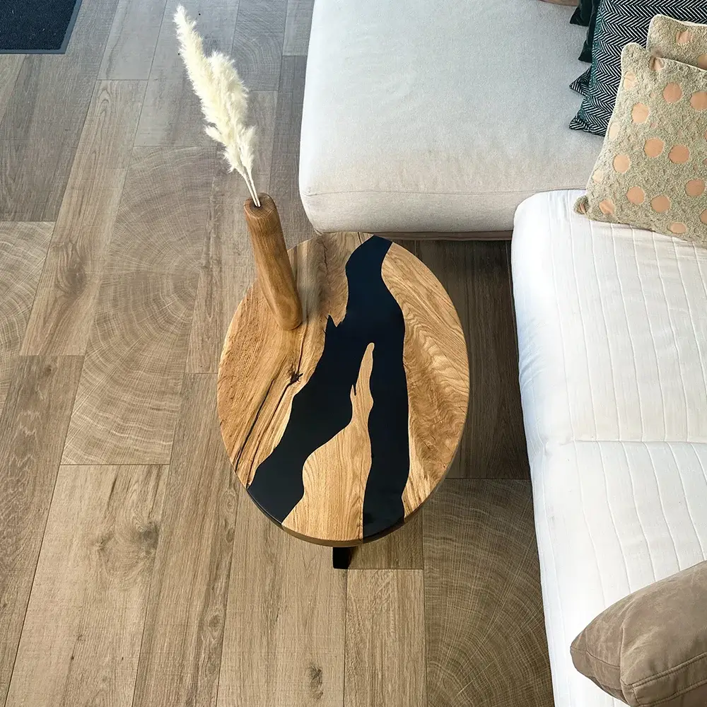 Satinsvart harts används för att skapa en slät, matt yta som omsluter bordsskivan. Den satinerade finishen ger hartset en subtil, sofistikerad glans, vilket ytterligare förstärker bordets attraktionskraft.