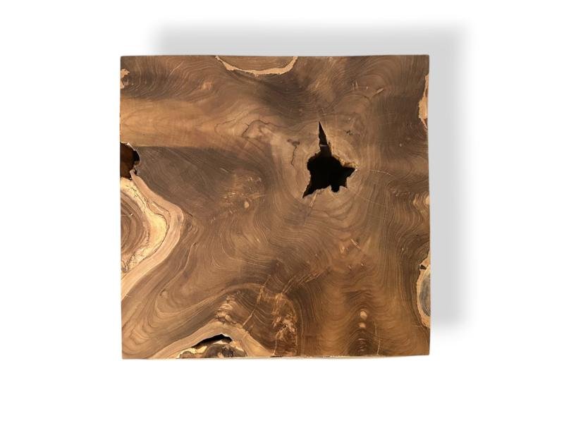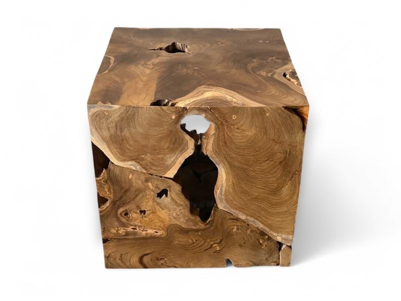 kubformade sidobord i teak är ihåligt, vilket gör det lättare och mer praktiskt. Dess design har naturliga former och dekorativa hål som förstärker träets äkthet. De raka linjerna, i kombination med hålen, skapar en unik visuell kontrast som ger en modern och organisk touch till alla utrymmen.